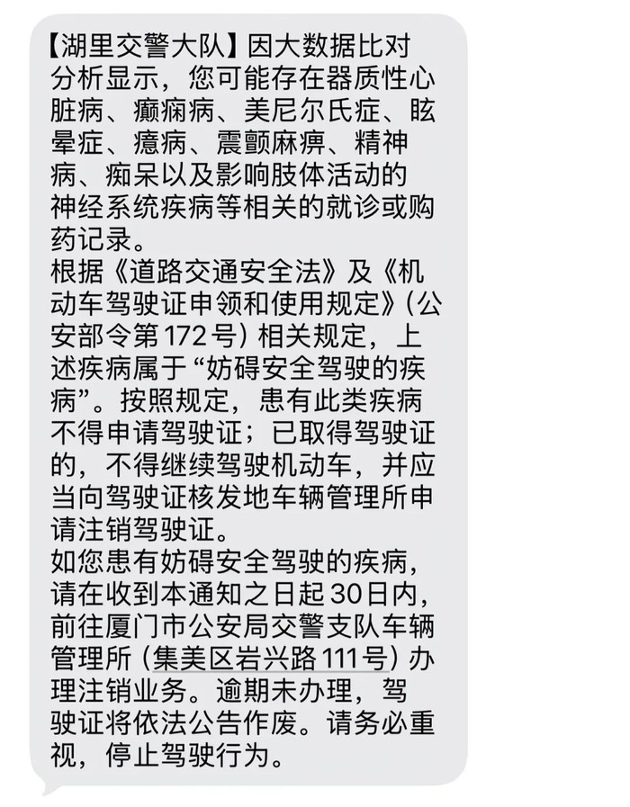 3月30日,厦门市湖里区交警部门使命主谈主员暗示,确乎有发送此类短信,已有多东谈主斟酌。该短信仅仅领导,驾驶员接到信息后,提出前去辖区交警部门进一步核实,或需要签署欢喜书或开具病院诠释。“购买关联药品后,可能会收到短信。要是(驾驶员)真有这些疾病,开车也很危急,是为了寰宇安全,具体情况不错问车管所。”