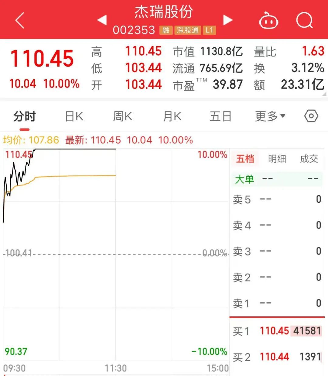 另一个热门是杰瑞股份涨停,最新市值1130.8亿元。