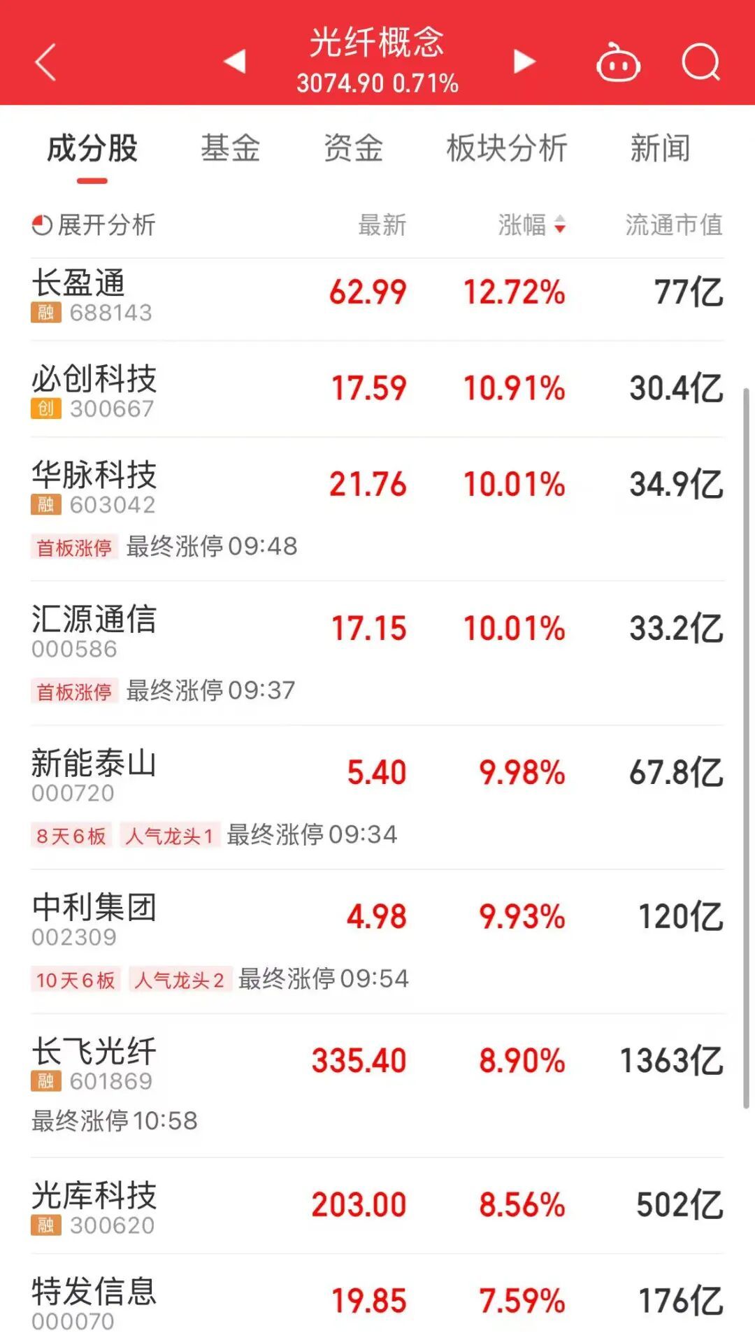 再来看光纤板块,今天上昼,龙头股长飞光纤飞腾8.9%,股价创历史新高,最新市值为2776.8亿元。亨通光电飞腾5.06%,盘中股价也创历史新高。