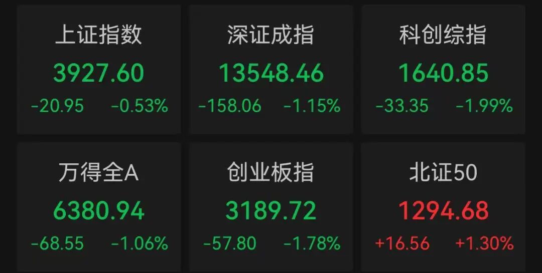 上昼收盘,上证指数下降0.53%,深证成指下降1.15%,创业板指下降1.78%,科创综指下降1.99%。