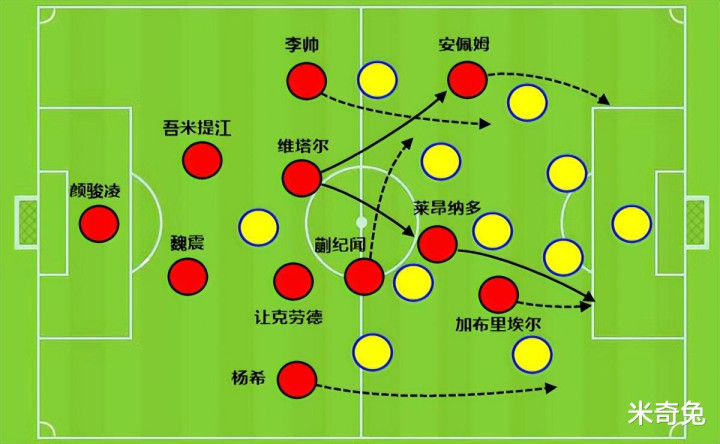 尤其是维塔尔往左路分球更顺脚(维塔尔给右路需要对角线转动,很难通过直塞找内线,只可长传给外线杨希),故意于安佩姆单兵起速后冲击。