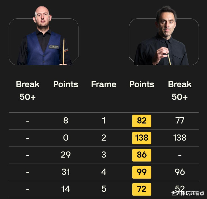 在同时刻段适度的其他比赛中,历史第一东说念主奥沙利证书借单杆打出138分、77分、96分和52分的表连胜五局以5-0横扫塞尔特。