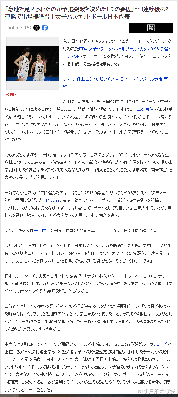 日本媒体《DAZN》写说念:在三连败后取得二连胜,日本女篮彰显了斗志是蹂躏世初赛的要津成分。