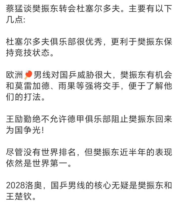 驰名乒乓球讲明注解蔡猛就这个问题谈了我方的见地,他以为樊振东转会杜塞尔多夫俱乐部,是有我方思法的,因为萨尔布吕肯签约了巴西选手雨果和瑞典选手莫雷加德,而这两位则是国乒当今最主要的敌手之一,樊振东思和这两位交手就不成在归拢个俱乐部。