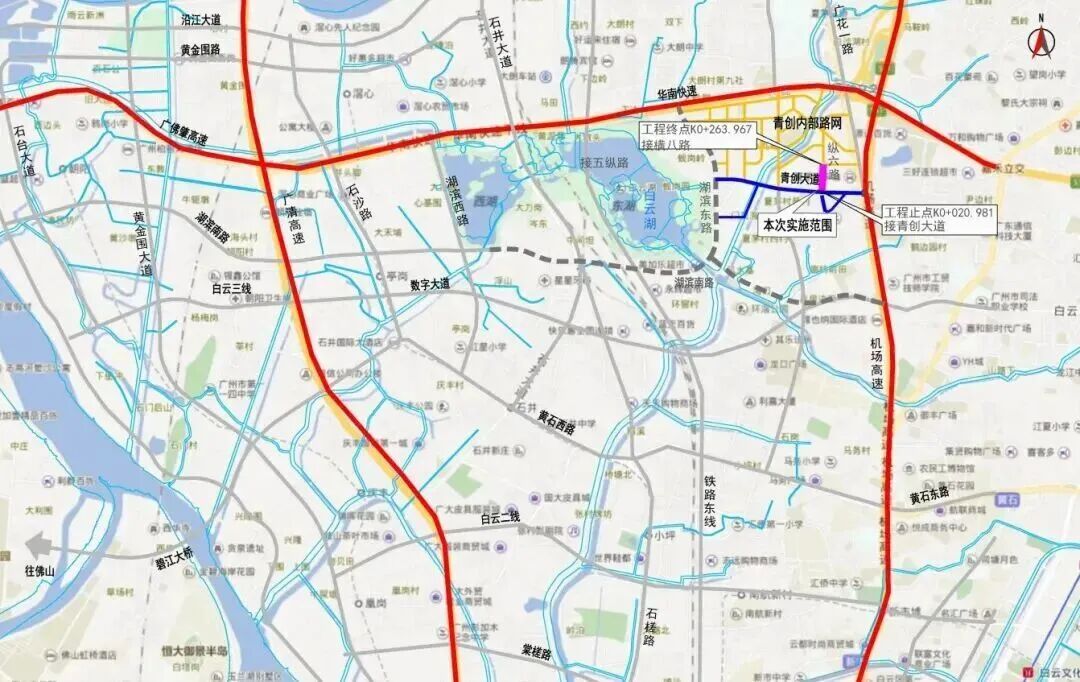 青创大路位于白云湖街,合座呈东西向,西起湖滨东路,东至广花一齐。名目筹办蹊径总长约1.205km,西起五纵路,东至广花一齐大地辅谈,谈路等第为城市骨干路,双向6车谈,设想速率50km/h,红线宽40m。其中,该名目还包含跨涌桥一座,桥梁长度约70米,以及保利配建段谈路加铺抬升。