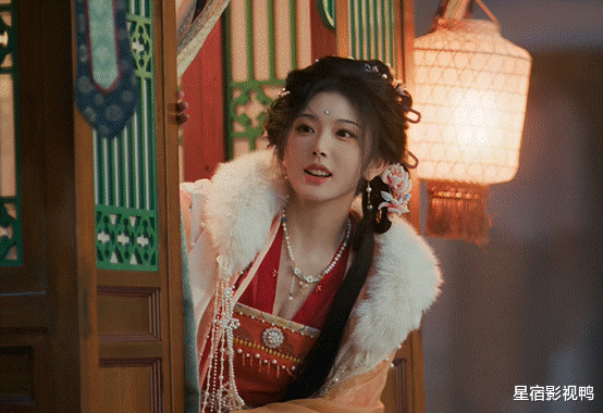她相比符合一些色彩亮堂的造型,橙红色长裙搭配毛领披风,衬得她愈加明艳。