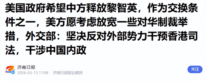 1.《好意思国政府但愿中方开释黎智英,作为交换条目之一,好意思方愿辩论放宽一些对华制裁举措,莽撞部:刚烈反对外部势力侵略香港功令,插手中国内务》2026-03-13 17:08 | 起首:济南日报