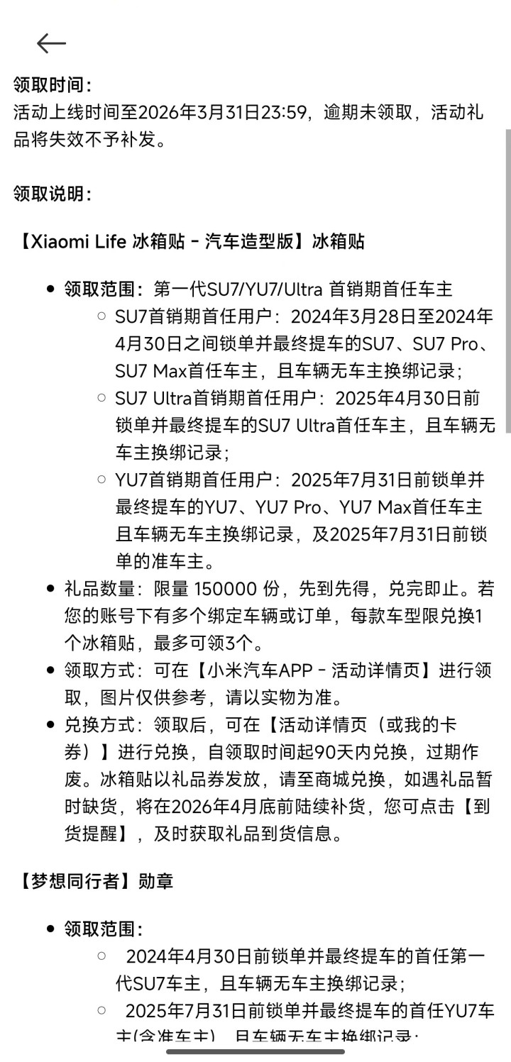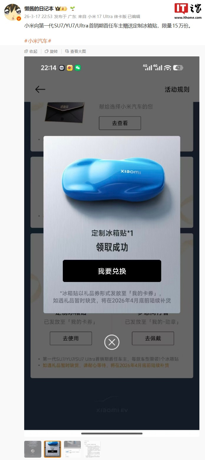 IT之家3月17日音信,据博主@懒酱的日志天职享,小米向第一代SU7/YU7/Ultra首销期首任车主支持定制雪柜贴,限量15万份。