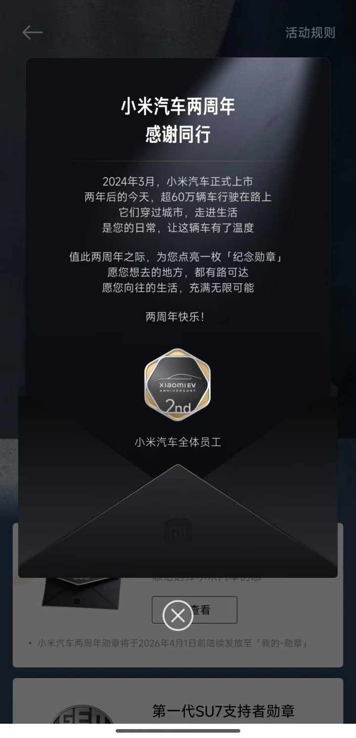 另外,小米汽车还为车主点亮了一枚「记念勋章」,庆祝小米汽车上市2周年。
