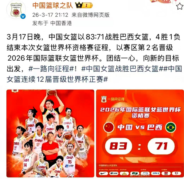 大伙儿熬夜看球值了!就在昨天晚上,我们中国女篮在武汉主场,83-71拿下了巴西队。说真话,终末一节给我看得小腹黑砰砰跳,好在着力是好意思的,密斯们用一场成功给此次世初赛收了尾。