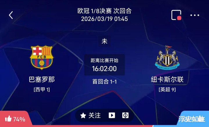 北京时刻2026年3月19日凌晨1:45,欧冠16强赛次回合,巴萨将在主场迎战纽卡斯尔联。
