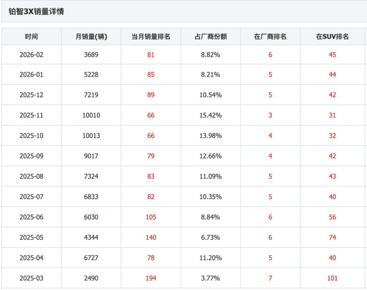 不外,当技艺步入2026年,阛阓表情断然发生滚动。1月,铂智3X的销量下滑至2236辆,环比跌幅高达84.02%。此番销量升沉,既受春节假期等季节性身分牵动,也突显出新能源阛阓竞争的尖锐化态势。在10 - 15万这一价钱区间,比亚迪元PLUS、星河E5、深蓝L07等竞品来势汹汹,铂智3X正承受着家具力抓续升级的严峻挑战。