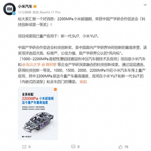 快科技3月18日音信,小米汽车当天发文称,2200MPa小米超强钢,荣获中国产学研合营促进会“科技翻新收场一等奖”,技俩收场现已量产期骗于:新一代SU7、小米YU7。