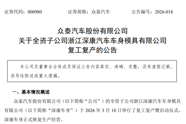 IT之家3月18日音信,众泰汽车当天发布公告称,公司全资子公司浙江深康汽车车身模具有限公司于3月18日复工复产,清雅收复分娩谋略。