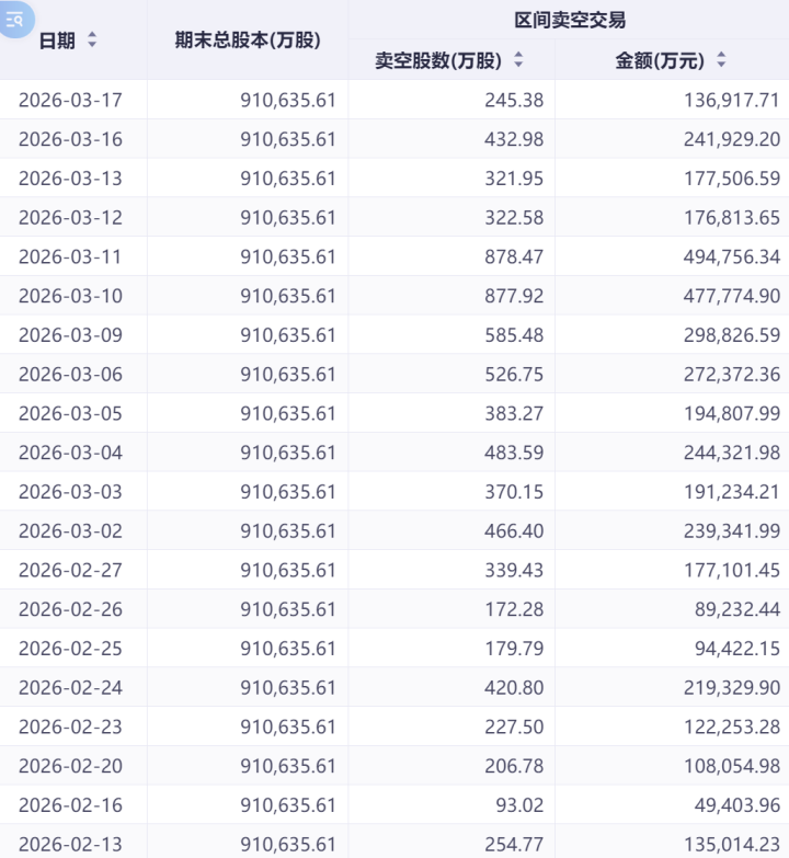 好意思团(03690.HK)的卖空数据回落幅度相对较大。卖空股数从3月9日的2319.36万股降至3月17日的1157.02万股,降幅达50.11%,时分一度降至657.36万股。卖空金额从17.97亿港元降至9.36亿港元,降幅为47.91%,时分一度降至5.03亿港元。