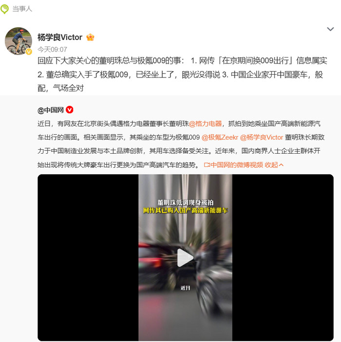 3月18日,祯祥集团高档副总裁杨学良公开回复,证据该信息属实。他直言:“董总确已脱手极氪009,中国企业家开中国豪车,般配,气场全对,目光没得说!”