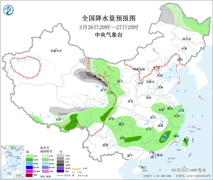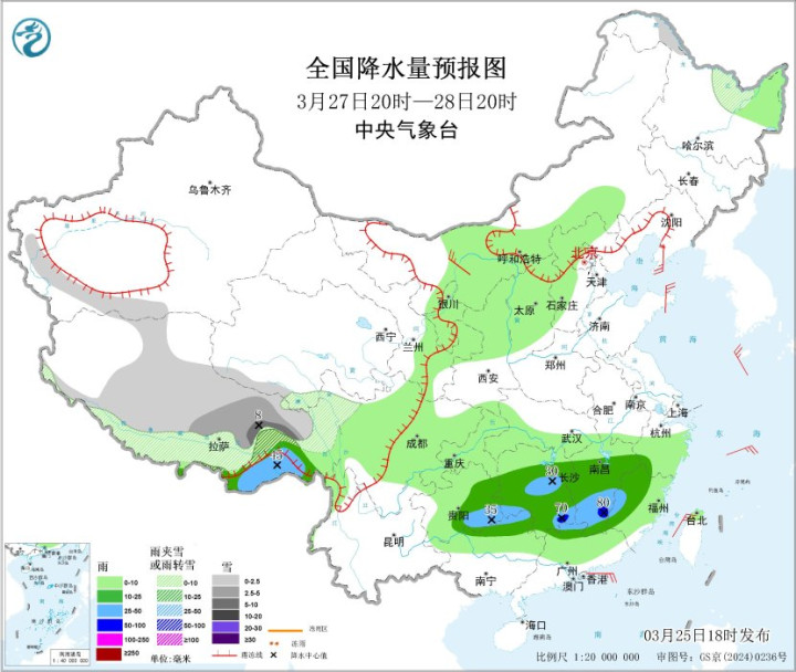 25昼夜间至28日,青藏高原东部多雨雪天气,西藏东部、青海东部和北部、甘肃、川西高原北部等地部分地区有小到中雪或雨夹雪,局地有大到暴雪;西藏东南部有中到大雨。