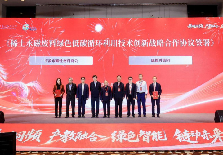 宁波市磁性材料商会与康恩贝集团讲求签署《稀土永磁废物绿色低碳轮回讹诈时代鼎新策略配合公约》,两边将联袂攻克废物轮回讹诈要津时代,助力稀土策略资源绿色轮回发展。