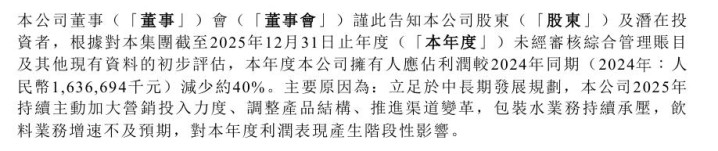 华润饮料走漏的财报数据显露,公司预测2025年归母净利润较2024年同时的16.37亿元下落约40%。华润饮料对此解说称,主要原因为,驻足于中永久发展策动,公司2025年合手续主动加大营销参加力度、出动产物结构、鼓动渠说念变革,包装水业务合手续承压,饮料业务增速不足预期,对今年度利润知道产生阶段性影响。