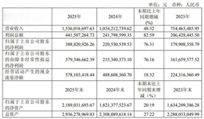 2025 年,蓝特光学紧抓行业发展机遇,依托中枢客户群上风与千般化产物布局,达成贸易收入 15.36 亿元,较上年同期的 10.34 亿元增长 48.52%;利润总和达 4.42 亿元,同比增长 82.59%;包摄于上市公司鼓动的净利润 3.89 亿元,较上年的 2.21 亿元增长 76.31%;包摄于上市公司鼓动的扣除相配常性损益的净利润 3.79 亿元,同比增长 76.16%。