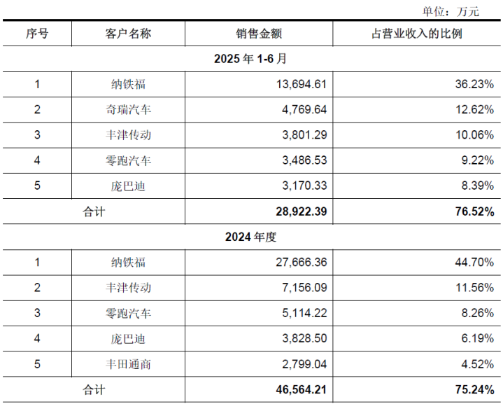 不仅如斯,腾励传动举座客户承接度也处于高位。表现期内,公司对前五大客户的销售收入分歧为4.25亿元、4.6亿元、4.66亿元、2.59亿元,占贸易收入的比例长期守护在75%以上,其中2022年更是高达83.23%,2025年1-6月仍达76.52%,客户结构极端承接。