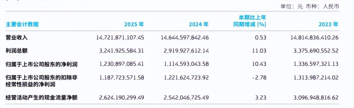 年报数据表露,重庆啤酒2025年结束啤酒销量299.52万千升,同比增长0.68%,商业收入为147.22亿元,同比微增0.53%,归母净利润同比增长10.43%至12.31亿元,为止了2024年营收净利双降的趋势,再行收复了增长,守住了基本盘。