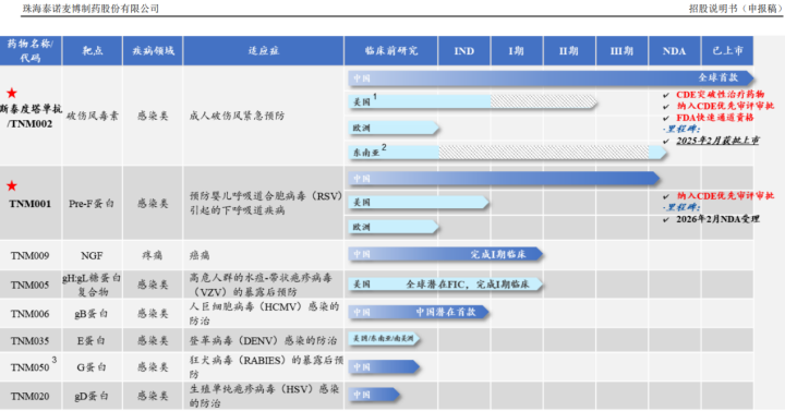 公司旗下寰球同类始创的斯泰度塔单抗打针液(即“重组抗破感冒毒素全东说念主源单克隆抗体TNM002”,商品名:新替妥®)已上市,TNM001(抗呼吸说念合胞病毒RSV单抗)已在中国提交NDA(药品上市许可肯求)并获受理,2款候选药物TNM009(抗神经助长因子NGF单抗)及TNM005(抗水痘-带状疱疹病毒VZV单抗)已完成临床I期窥伺,1款候选药物TNM006(抗东说念主巨细胞病毒HCMV单抗)已获批IND(新药征询肯求),以及3款候选药物处于临床前阶段。