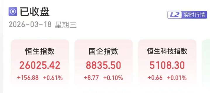 上证报中国证券网讯(刘禹希记者严晓菲)3月18日,港股三大指数午后走强,集体收红。戒指收盘,恒生指数涨0.61%,报26025.42点;恒生国企指数涨0.1%,报8835.50点;恒生科技指数涨0.01%,报5108.30点。