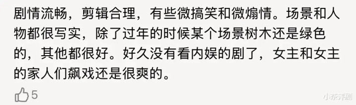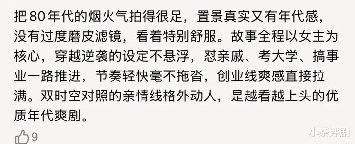 故事全程以女主为中枢,穿越逆袭的设定不悬浮,怼亲戚、考大学、搞业绩一齐激动,亲情线动东谈主,创业线拉满,越看越上面。