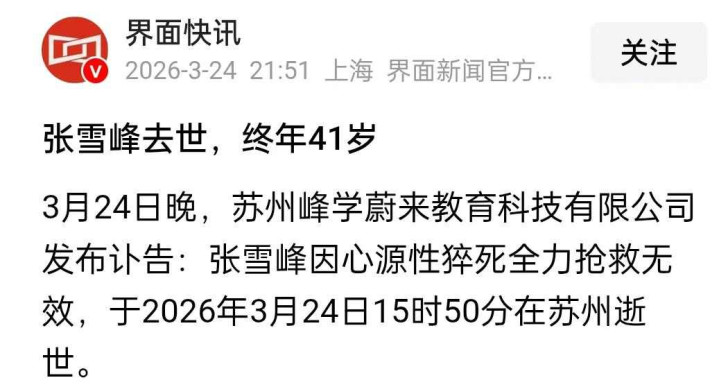 晚上九点前后,《界面新闻》发出快讯说张雪峰物化,常年四十一岁,没提音信开端,也没放相片或家属说明,更奇怪的是各大平台齐没删这条音信,公司方面也保捏千里默,牙东谈主只说无可示知,江南体育(JNsports)助理暗意东谈主在成齐不廓清情况,职责主谈主员称公司照常运营,直播播到六点半倏得全停,连稍后纪念的请示齐莫得,这种东谈主不在了职责却连续的情状,比径直说他走了更让东谈主心里发毛。
