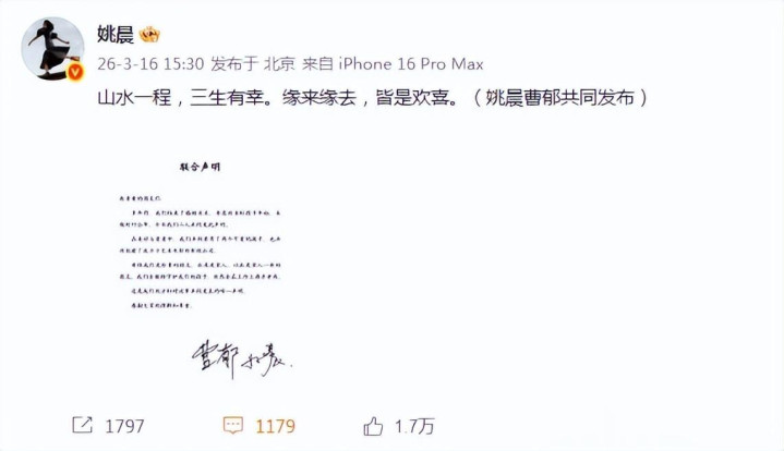 前不久,姚晨发文臣宣与曹郁仳离,让外界大吃一惊。两东谈主授室多年一直都相当低调,合体秀恩爱的次数少之又少。粗略亦然全球稳健爱妻俩的这种低调的幸福,因此才不会奇怪他们不对体撒糖。但没思到如斯恩爱甘好意思的两东谈主,最终照旧仳离了,如实让东谈主独特唏嘘。