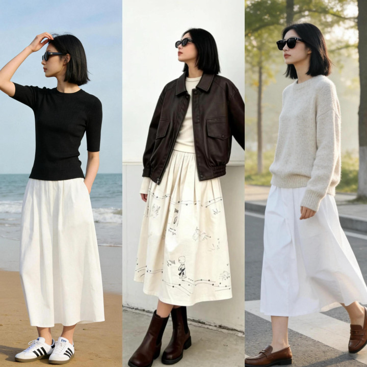 要是体格有点微胖,况兼有点胯宽腿粗,梨形骸格的女性就要选拔一条过膝不外脚踝的高腰白色伞裙来穿搭,才智把体格的弱势藏起来,让我方也能领有运动的体态。
