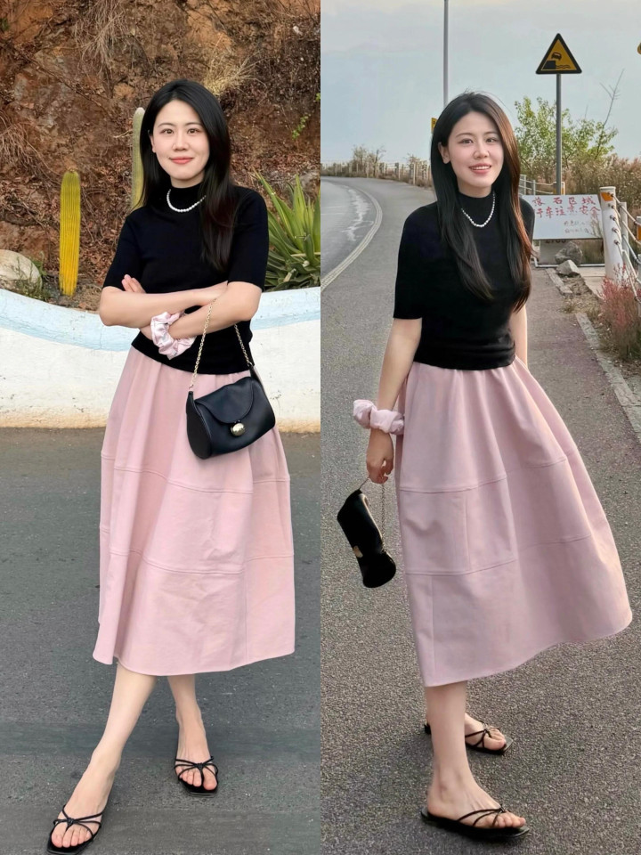 就算我们是奔 3 的女性,思要让我方自带青娥感,也不要刻意装嫩,不妨选拔比拟有质感的玄色古道短袖,配上粉色的高腰伞裙,脚踩一对玄色凉拖鞋,这样的穿搭显年青又富饶耐看,从简斯文,应付开脱粗鲁的造型。