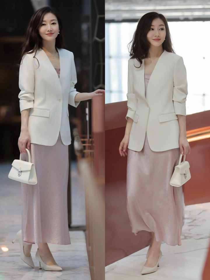 Tips③:白色无领西装+真丝粉色连衣裙