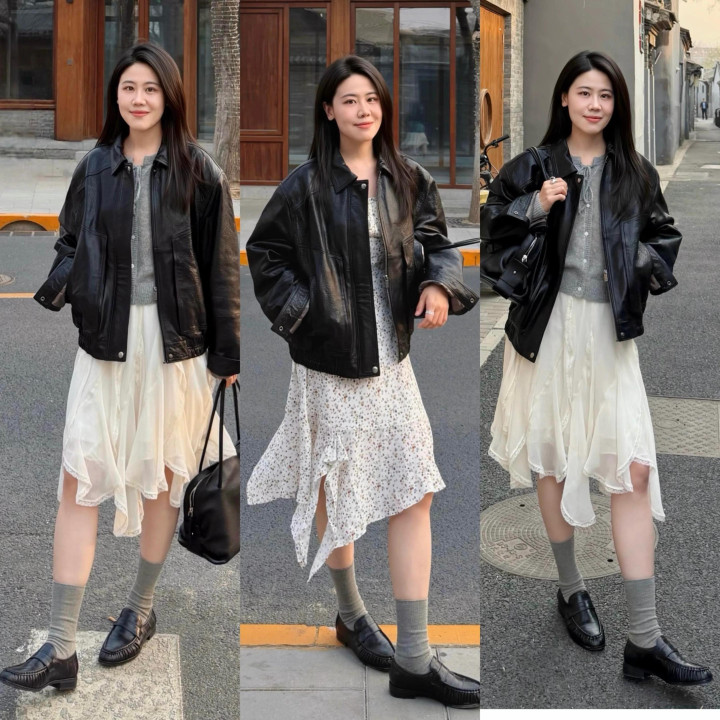 当我们穿上玄色的皮外衣时,通盘这个词东说念主就显得很酷,有一种抗拒感,在和暖和的半裙组合刚柔并济穿搭,举座干净利落。
