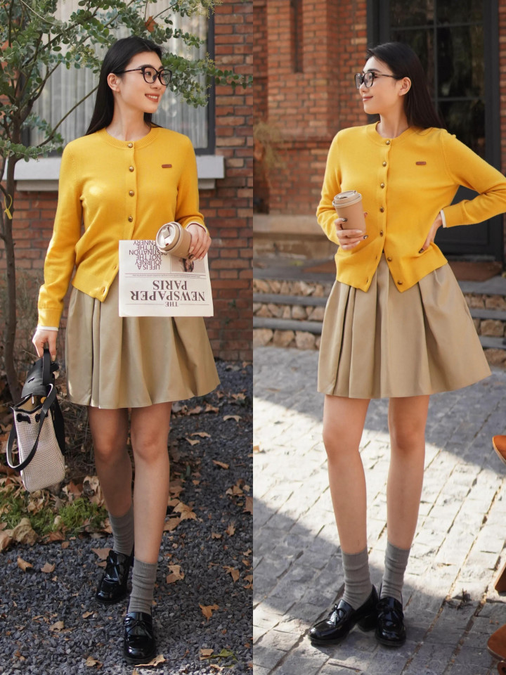Tips③:鹅黄色开衫+卡其色压褶短裙