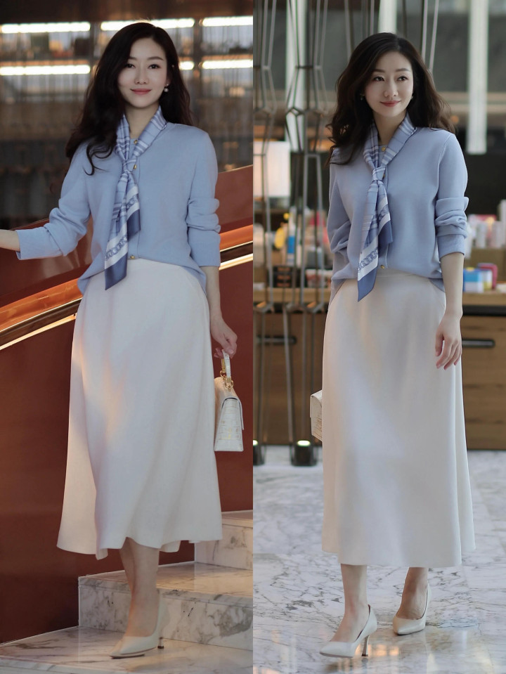 一对白色的浅口高跟鞋和白色的半裙组合,顺色搭配更显良好,再用雾霾蓝的古道衫来组合,让东说念主看起来新鲜又减龄,甜而不腻,暖和大方。