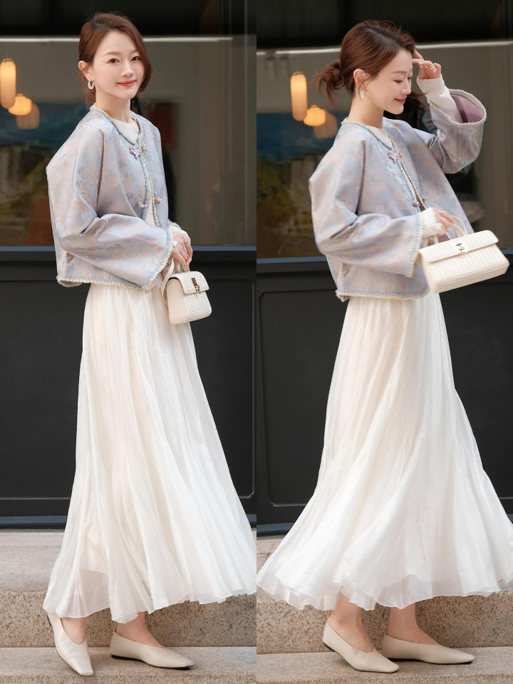 就像上头用新考中短外衣配上白色的薄纱伞裙,脚踩浅口低跟单鞋,既优雅又显耀,让你应付拿持春日氛围气味。