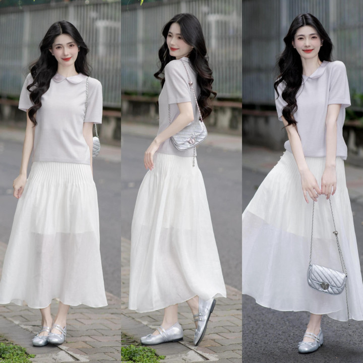 Tips ①:浅紫色短袖+白色薄纱伞裙