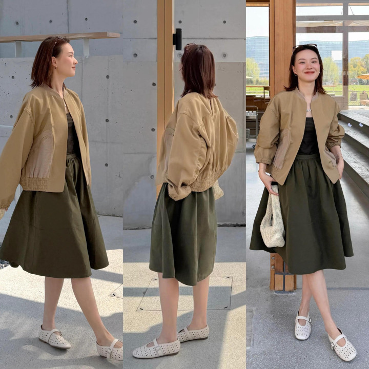 不妨我们不错从上衣荆棘功夫,举例用一件好意思拉德色系的夹克外衣,配上军绿色的高腰伞裙,脚踩镂空瞎想的浅口平底单鞋,这样的穿搭又帅又好意思。