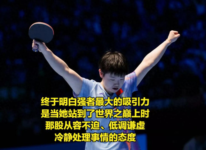 粗略,在此之前,咱们广宽球迷们所认为的刚劲,是像巨东说念主般那样无东说念主能敌,然则听了孙颖莎底下这段经典采访后,才终于显然:英雄最大的眩惑力,是当她站到了寰球之巅上时,那股冷静不迫、低调谦善、冷静处治事情的格调。