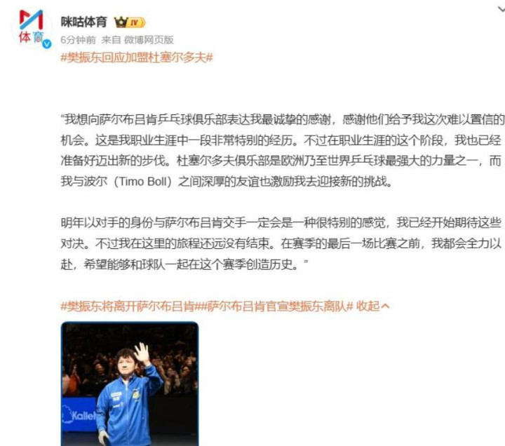 之后,樊振东也作念出复兴,证据了离队的事实。