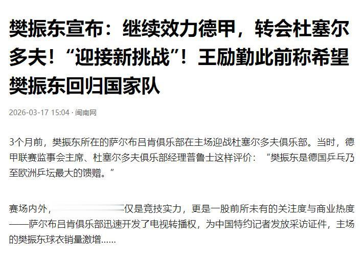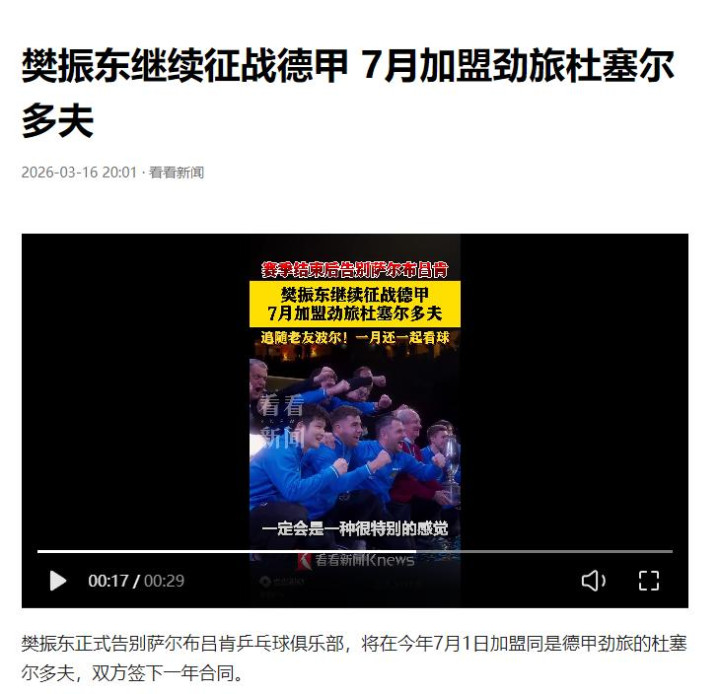 而在告示离队后,樊振东又火速与杜塞尔多夫签约。