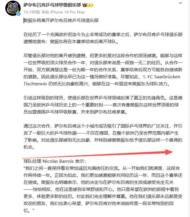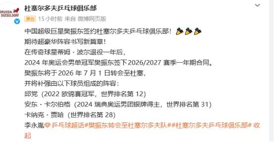 2025年,樊振东摄取赴德,加盟萨尔布吕肯俱乐部。