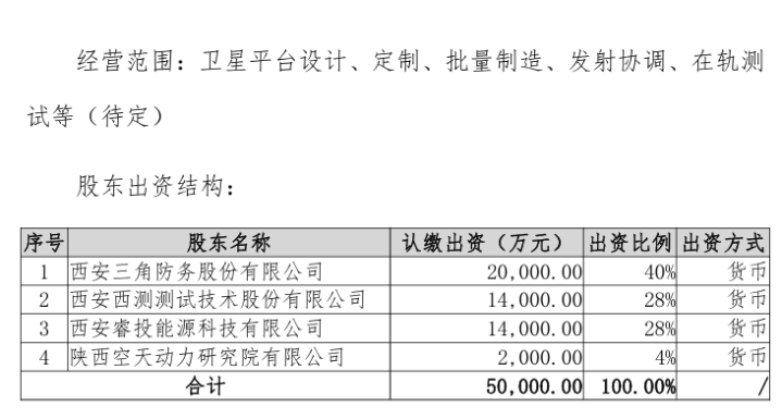 股东结构上,三角防务捏股40%,西测测试、睿投能源分裂捏股28%,陕西空天院则捏股4%。