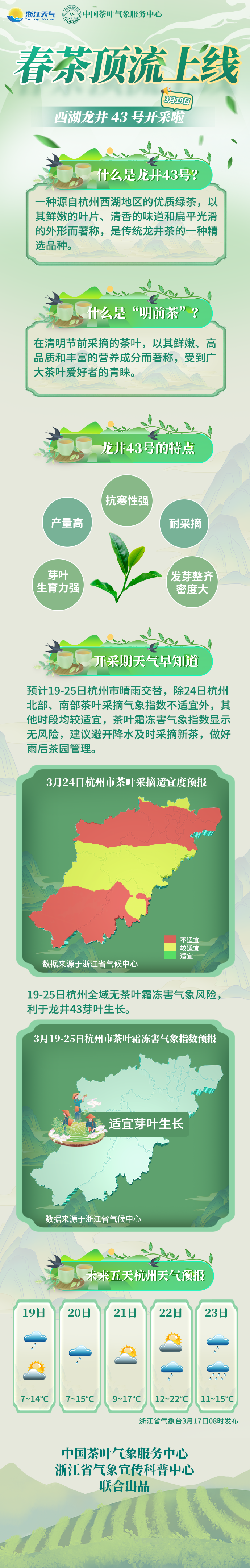 值得一提的是,西湖龙井43号将于翌日(3月19日)拓荒!浙江省宣科中心麇集中国茶叶时事奇迹中心麇集推出春茶采摘时事奇迹专报,精确护航每一派鲜叶的采摘时机。