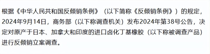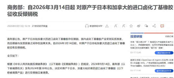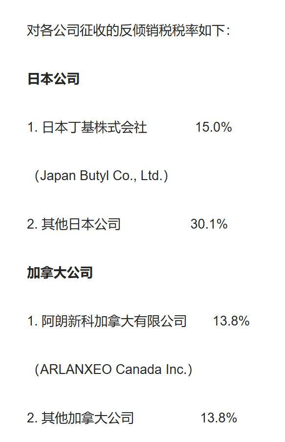 公告明确,自3月14日起,对原产于日本和加拿大的入口卤化丁基橡胶征收15%至30%的反推销税,有用期5年。