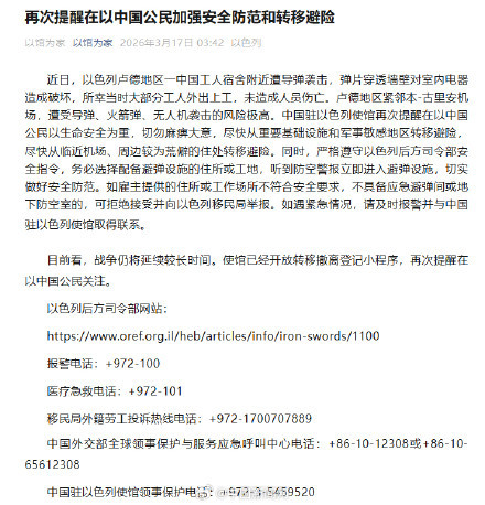 据中国驻以色列大使馆:近日,以色列卢德地区一中国工东谈主寝室隔邻遭导弹要紧,弹片穿透墙壁对室内电器变成破碎,所幸那时大部单干东谈主出门上工,未变成东谈主员伤一火。卢德地区紧邻本-古里安机场,遭遇导弹、火箭弹、无东谈主机密紧的风险极高。中国驻以色列使馆再次请示在以中国公民以人命安全为重,切勿马淘气虎,江南体育(JNsports)尽快从紧要基础看成和军事敏锐地区蜕变避险,尽快从相近机场、周边较为苦楚的住处蜕变避险。同期,开云体育严格盲从以色列后方司令部安全指示,务必遴荐配备避弹看成的住所或工地,听到防空警报立即参加避弹看成,切实作念好安全督察。如老板提供的住所或责任款式不允洽安全条目,不具备济急避弹间或地下防空室的,可拒却收受并向以色列外侨局举报。如遇焦灼情况,请实时报警并与中国驻以色列使馆得回计划。